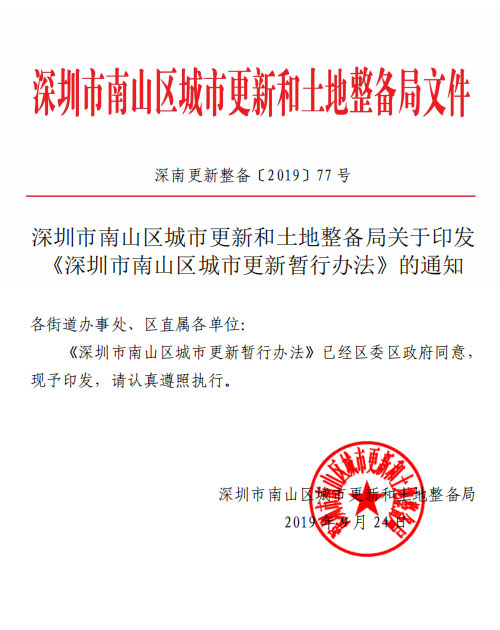 2019年10月,规范南山区城市更新工作、明确区城市更新工作领导小组及其成员单位具体职责、细化优化城市更新工作流程、融合产业监管措施与城市更新审批程序。南山区更新局起草了《南山区城市更新暂行办法》。