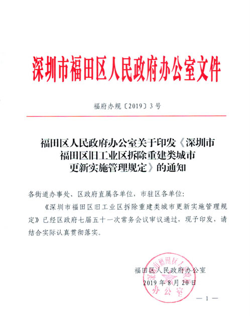 福田区于2019年8月20日,结合旧工业区改造现状,根据市政府关于产业升级城市更新项目要求,率先出台《福田区旧工业区拆除重建类城市更新实施管理规定》。完善“工改工”城市更新项目审查机制,严格产业监管要求,引导旧工业区向创新驱动、功能完善、空间优质、集约高效的高质量产业空间转型,严防工业用地房地产化、产业空心化,保障实体经济持续稳健发展。